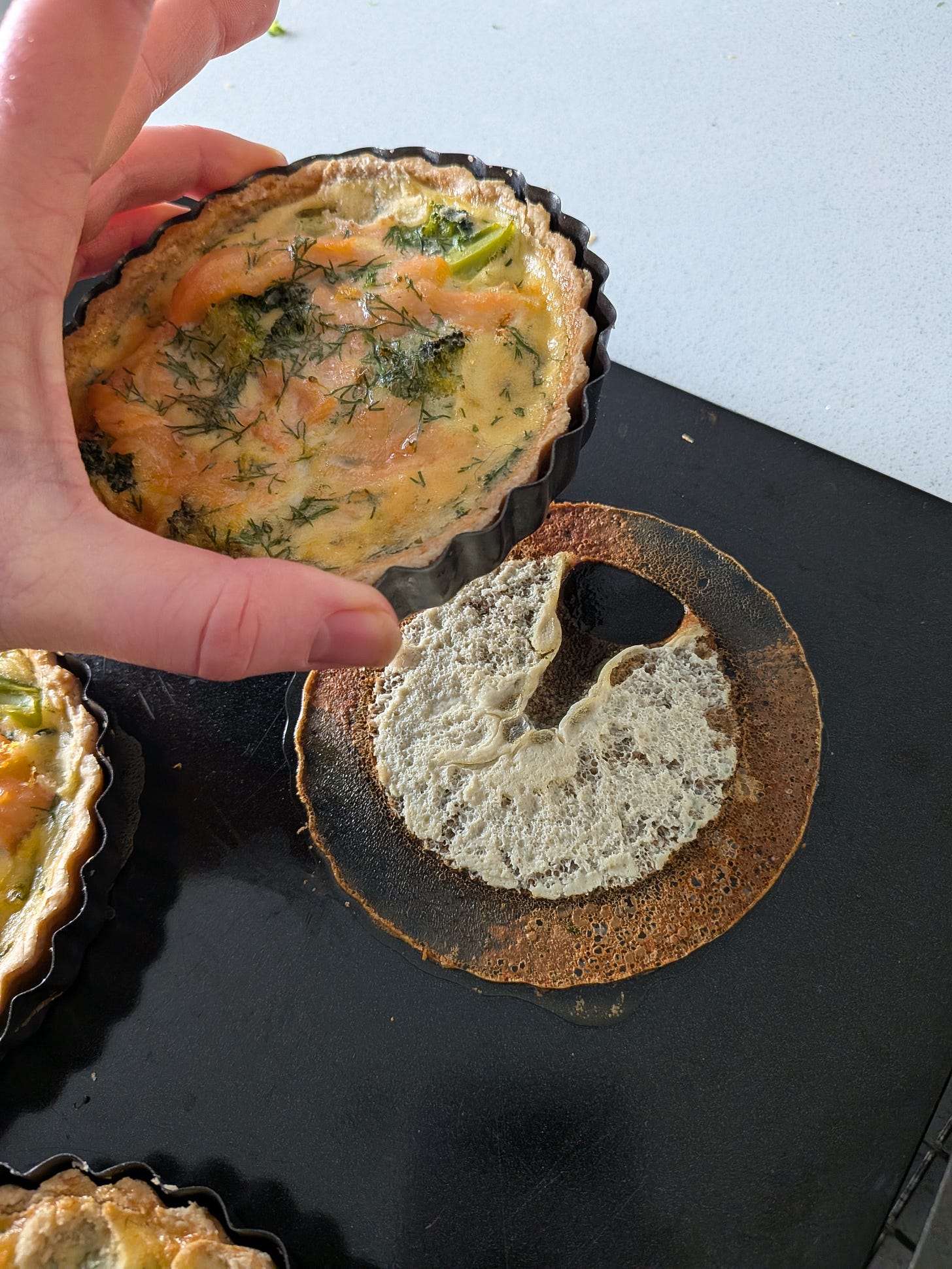 Whisk together your cream, eggs, dill and lemon zest and pour into a small jug. It’s really vital you use a small jug to slowly and delicately pour the mixture into all the nooks and crannies of your tartlets. For one test I used a large bowl, and spilled egg everywhere.