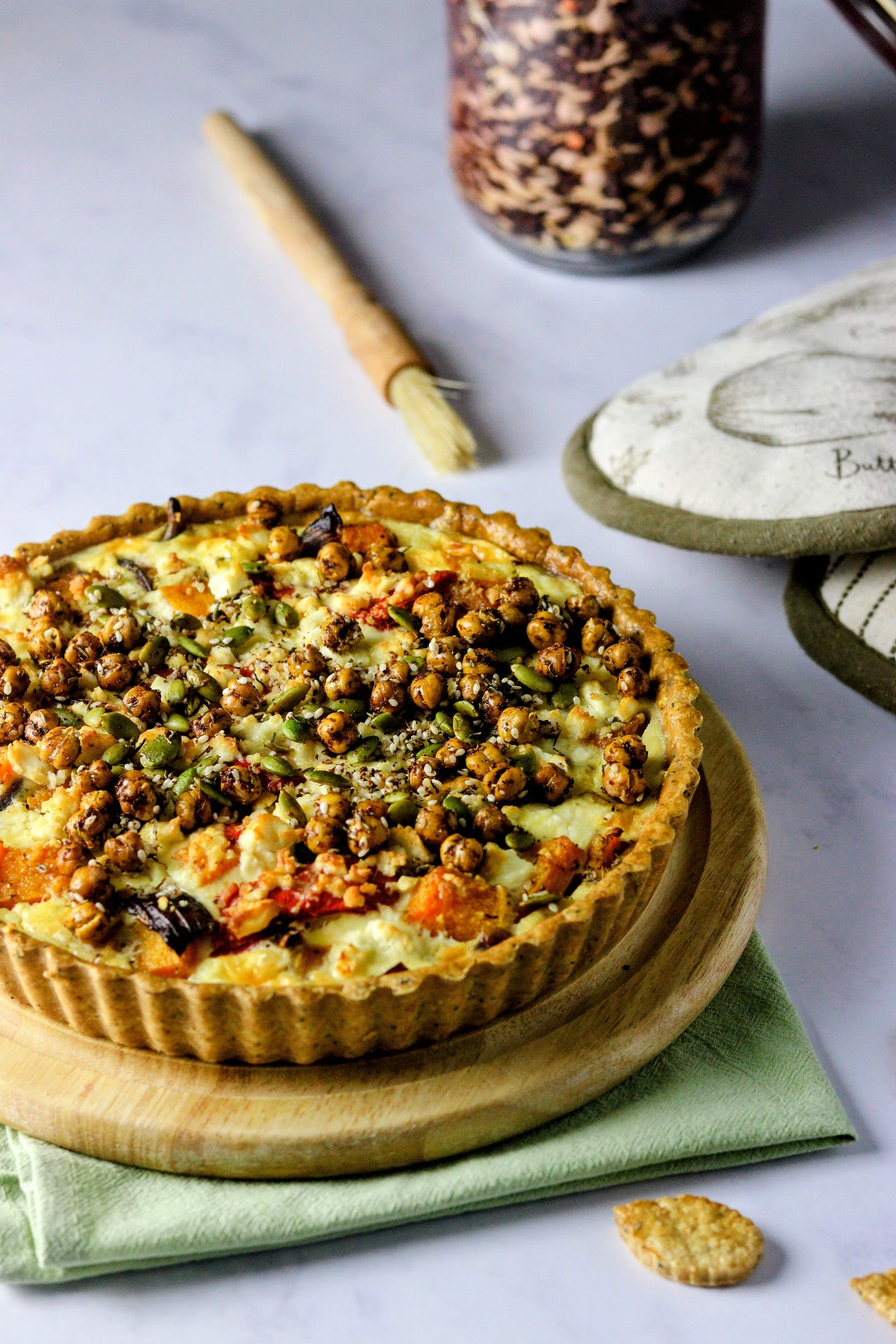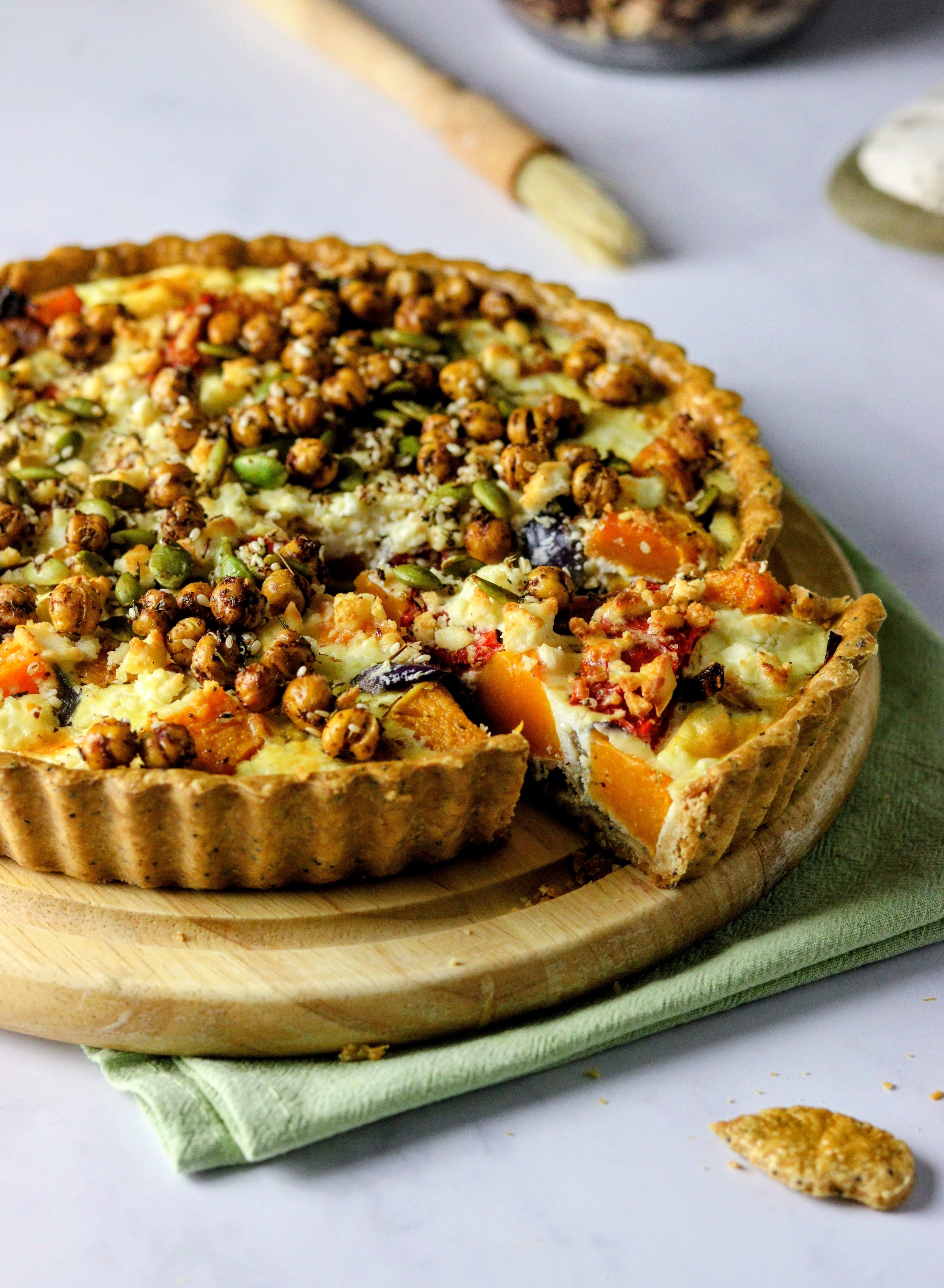 The idea to put Za’atar on a butternut tart isn't mine. It’s a suggestion in a Bake Off Book, for a butternut and goat’s cheese tart I have long been obsessed with. Over the years I have tweaked it, and changed it, and adapted it, until I had a version with more vegetables, less cream and cheese, higher fibre spelt pastry and more Za'atar flavour, with crispy chickpeas too!