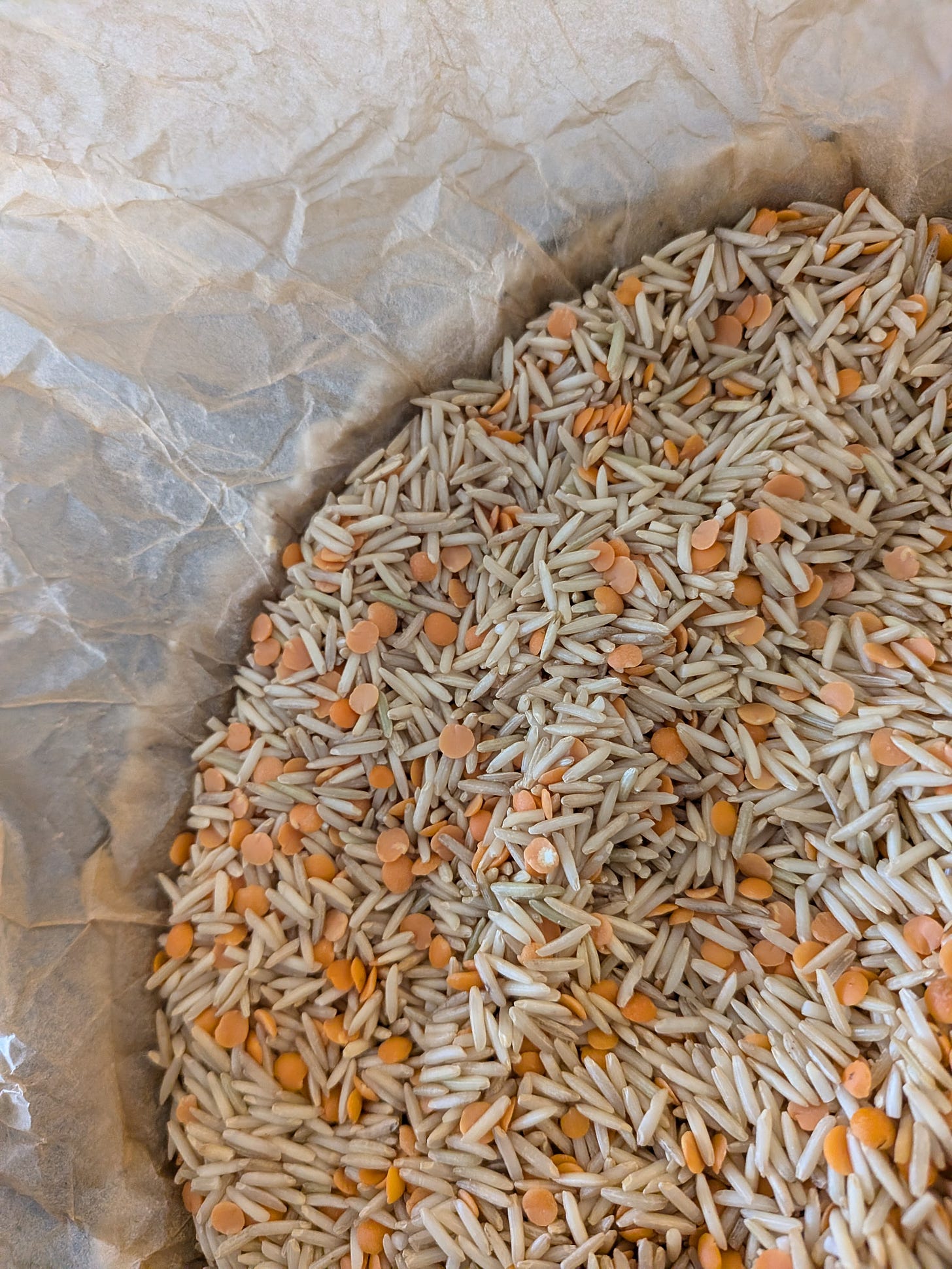 Take it out and pick up all the sides of your baking paper to remove all lentils and rice.